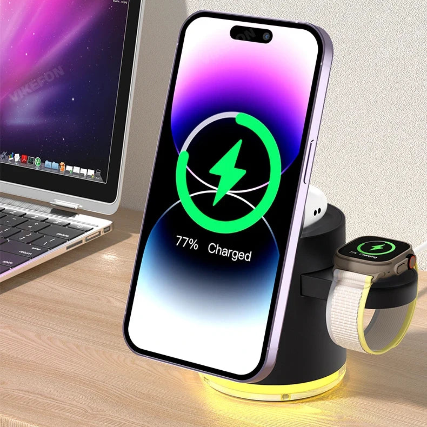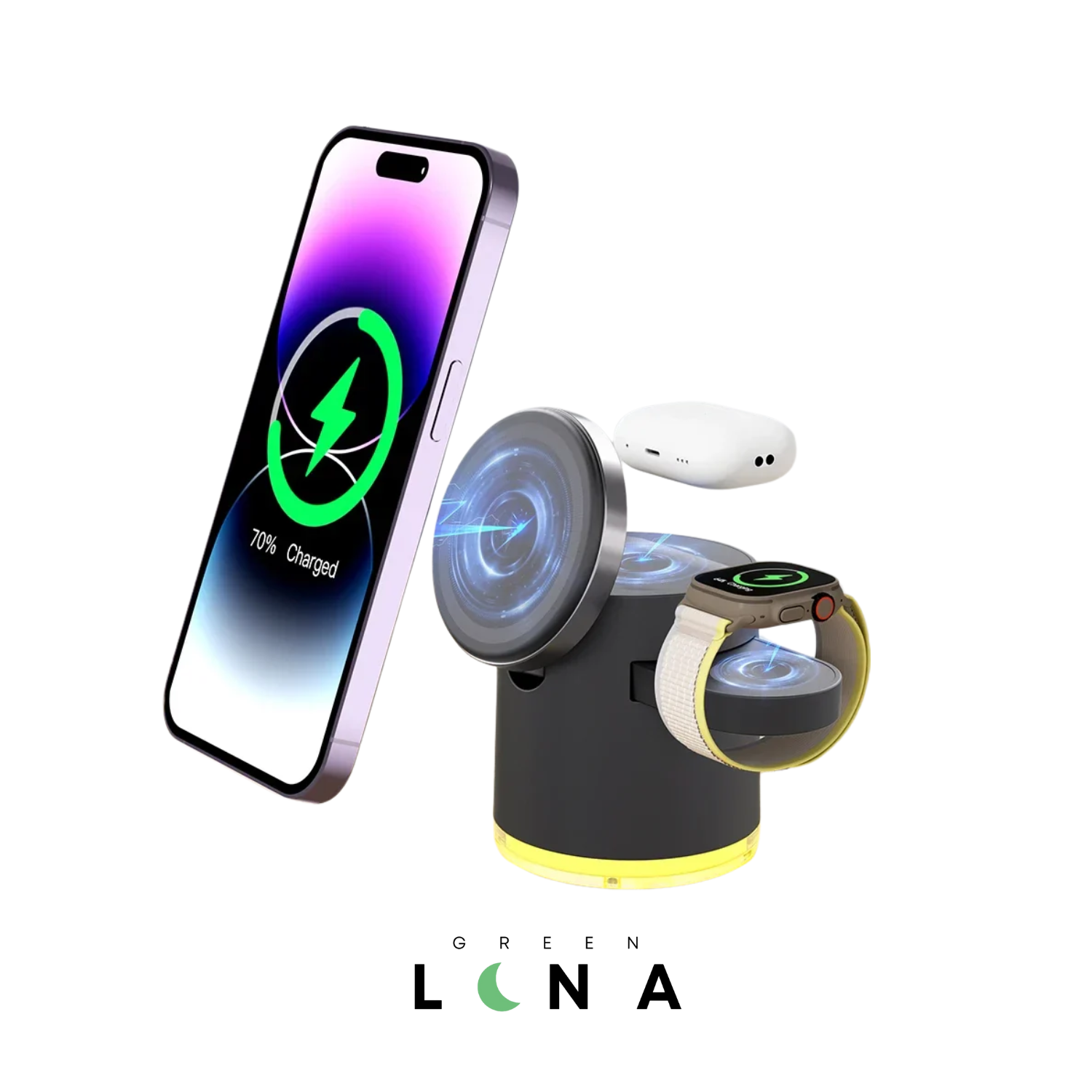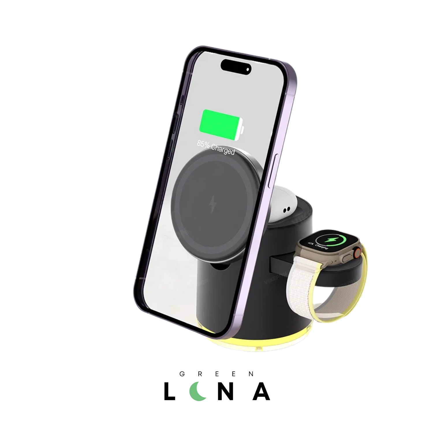 Cette station de charge sans fil 4 en 1 offre une solution polyvalente pour alimenter simultanément iPhone, Apple Watch et AirPods. Son design pliable et ajustable en fait un accessoire idéal pour la maison, le bureau ou les déplacements.